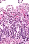 | LM | acute: mucosal changes (necrosis of epithelium, "ghost cells" = cells without nuclei, hemorrhage), submucosa edema with neutrophilic infiltrate, +/-fibrin thrombi; chronic: nuclear atypia - esp. of the stromal cells, fibrosis - esp. of the submucosa |
