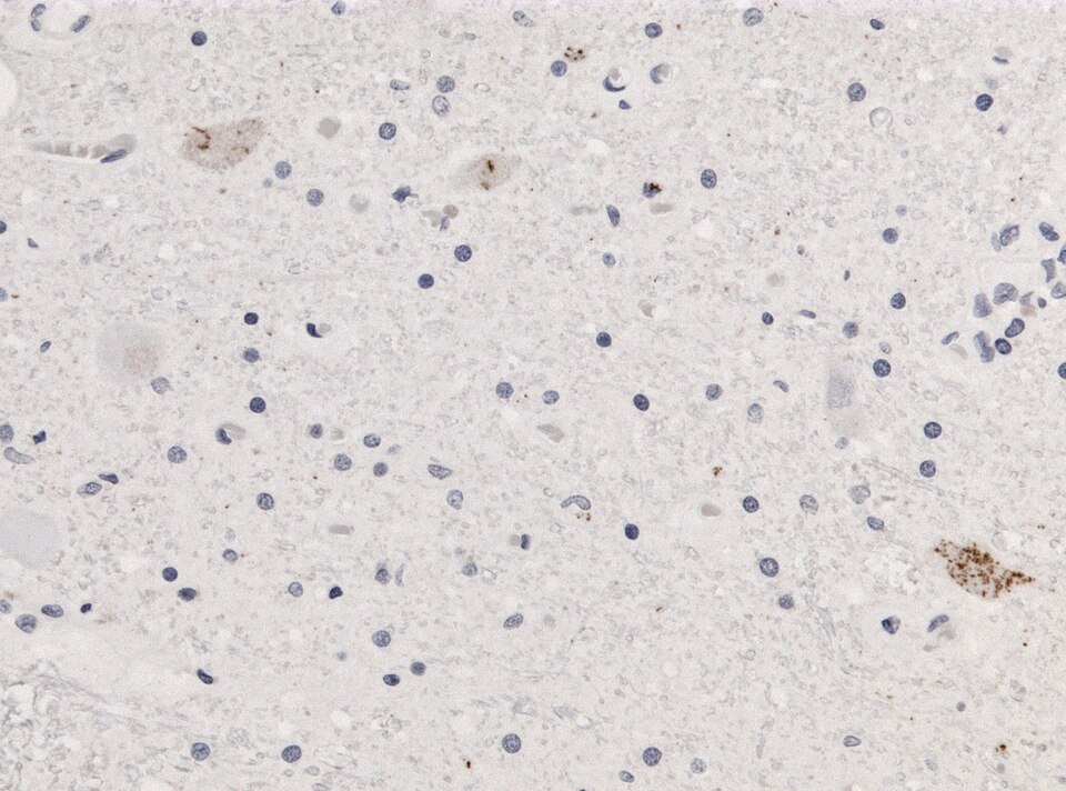 English: Immunohistochemistry specimen of Amyotrophic lateral sclerosis (ALS-TDP) showing TDP-43-positive inclusions (brown) in motor neurons.