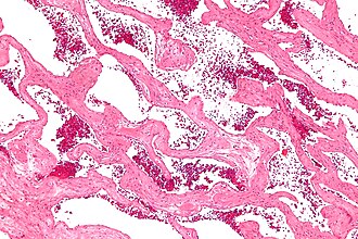 The sections show dilated vascular spaces containing red blood cells that are lined by endothelial cells without significant atypia. The vascular spaces are separated by bland fibrous tissue.