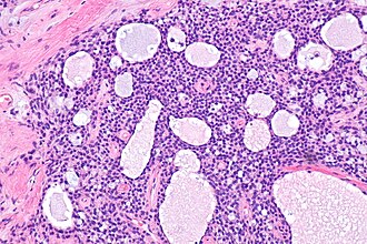 - ↑ 4.0 4.1 McCluggage, WG.; Chong, AS.; Attygalle, AD.; Clarke, BA.; Chapman, W.; Rivera, B.; Foulkes, WD. (Feb 2019). "Expanding the morphological spectrum of ovarian microcystic stromal tumour.". Histopathology 74 (3): 443-451. doi:10.1111/his.13755. PMID 30325056.