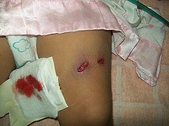 [[Image:Gunshot_wonud_to_leg.JPG|thumb|right|Gunshot wound to the leg showing entrance and exit. (WC)]] | |||