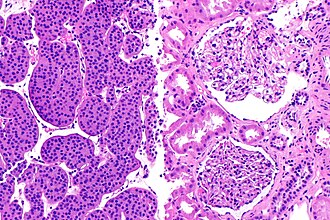 Renal oncocytoma (left of image) and normal kidney (right of image). Kidney biopsy. H&E stain. | |