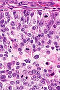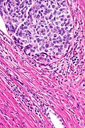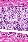 *Spreads from the [[urinary bladder]] usually - common.<ref name=pmid22520044>{{Cite journal | last1 = Huguet | first1 = J. | title = [Prostatic involvement by urothelial carcinoma in patients with bladder cancer and their implications in the clinical practice]. | journal = Actas Urol Esp | volume = 36 | issue = 9 | pages = 545-53 | month = Oct | year = 2012 | doi = 10.1016/j.acuro.2012.02.005 | PMID = 22520044 }}</ref> | *Spreads from the [[urinary bladder]] usually - common.<ref name=pmid22520044>{{Cite journal | last1 = Huguet | first1 = J. | title = [Prostatic involvement by urothelial carcinoma in patients with bladder cancer and their implications in the clinical practice]. | journal = Actas Urol Esp | volume = 36 | issue = 9 | pages = 545-53 | month = Oct | year = 2012 | doi = 10.1016/j.acuro.2012.02.005 | PMID = 22520044 }}</ref> | ||