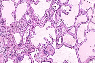 - ↑ 2.0 2.1 2.2 2.3 2.4 Amin, MB.; MacLennan, GT.; Gupta, R.; Grignon, D.; Paraf, F.; Vieillefond, A.; Paner, GP.; Stovsky, M. et al. (Mar 2009). "Tubulocystic carcinoma of the kidney: clinicopathologic analysis of 31 cases of a distinctive rare subtype of renal cell carcinoma.". Am J Surg Pathol 33 (3): 384-92. doi:10.1097/PAS.0b013e3181872d3f. PMID 19011562.