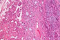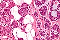 - Moderate eosinophilic cytoplasm in the (rare) ductal cells.
