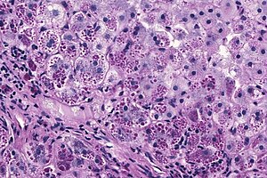 - ↑ 2.0 2.1 Qizilbash, A.; Young-Pong, O. (Jun 1983). "Alpha 1 antitrypsin liver disease differential diagnosis of PAS-positive, diastase-resistant globules in liver cells.". Am J Clin Pathol 79 (6): 697-702. PMID 6189389.