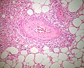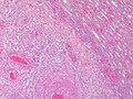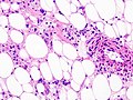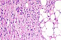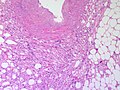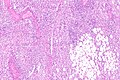 Micrograph of an angiomyolipoma - showing the three components (blood vessels (angio-) - left top, muscle (myo-) - elsewhere, fat (lipoma) - right bottom). H&E stain. | |