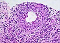 - Granulomatous inflammation around clear spaces (lipid).[2]