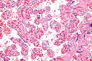 - ↑ 7.0 7.1 De La Ossa, MM.; Cabello-Inchausti, B.; Robinson, MJ. (Sep 2001). "Placental chorangiosis.". Arch Pathol Lab Med 125 (9): 1258. doi:10.1043/0003-9985(2001)1251258:PC2.0.CO;2. PMID 11520290. http://www.archivesofpathology.org/doi/full/10.1043/0003-9985%282001%29125%3C1258:PC%3E2.0.CO;2.