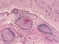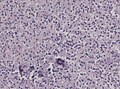 Auf diesem mit Kresylviolett gefärbten Querschnitt durch das Rückenmark sind Motorneuronen des Vorder- und Hinterhorn sichtbar (Bild 1). Bei höherer Vergrößerung erkennt man Mikrogliaknötchen (Bild 2). Diese enthalten Makrophagen, welche die Nervenzellen phagoyztieren (Neurononophagie, Bild 3). |