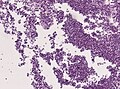 The sample consists mainly of tumour particles that show extensive calcifications which are already visible at low magnification (Picture 1). The tumour cells show perinuclear halos - a fixation artefact seen typically in oligodendrogliomas (Picture 2). This "fried-egg" appearance at higher cell density results in the so called "honeycomb" appearance. Oligodendrogliomas usually have monomprhic round nuclei with scant chromatin. Between the tumour cells delicate capillaries are present. In contrast to astrocytomas the tumor border is more pronounced, the infiltrative pattern is less evident (Picture 4). In absence of necrosis and almost no mitotic activity this tumour corresponds to WHO Grade II.