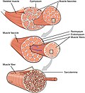 The skeletal muscle is anchored by tendons (or by aponeuroses at a few places) to bone and is used to effect skeletal movement such as locomotion and to maintain posture. Striated or skeletal muscle only contracts voluntarily, upon influence of the central nervous system.Skeletal muscle is further divided into several subtypes: