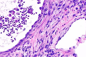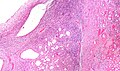 Micrograph of cystic nephroma (adult type) showing the characteristic stroma and hobnailed epithelium. H&E stain. | |