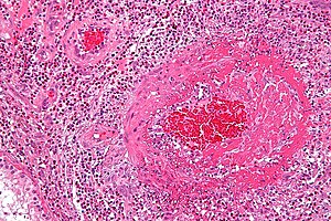 - ↑ Stone, JR.; Bruneval, P.; Angelini, A.; Bartoloni, G.; Basso, C.; Batoroeva, L.; Buja, LM.; Butany, J. et al. "Consensus statement on surgical pathology of the aorta from the Society for Cardiovascular Pathology and the Association for European Cardiovascular Pathology: I. Inflammatory diseases.". Cardiovasc Pathol 24 (5): 267-78. doi:10.1016/j.carpath.2015.05.001. PMID 26051917.