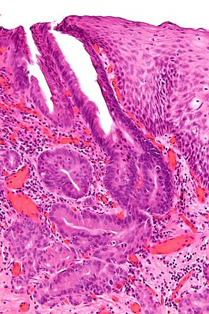 | LM DDx | high-grade columnar dysplasia of the esophagus, squamous cell carcinoma of the esophagus,gastric adenocarcinoma |