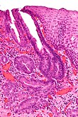 Esophagus connects the pharynx to the stomach. It is afflicted by tumours on occasion. Probably the most common affliction is gastroesophageal reflux disease (GERD). Most biopsies revolve around the questions: 1. intestinal metaplasia? 2. dysplasia? and 3. cancer?