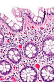 • "Line of muscularis mucosa" visible +/- test tube-like intestinal crypts.