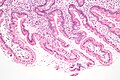 | LM | flagellate protozoa - pale/transluence on H&E, 12-15 micrometers (long axis) x 6-10 micrometers (short axis); +/-loss of villi, intraepithelial lymphocytes, inflammatory cells - especially close to the luminal surface |