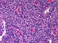 - Scattered large cells with pale eosinophilic cytoplasm may be observed[3].
