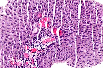 - ↑ Reis, LO.; Taheri, D.; Chaux, A.; Guner, G.; Mendoza Rodriguez, MA.; Bivalacqua, TJ.; Schoenberg, MP.; Epstein, JI. et al. (Jan 2016). "Significance of a minor high-grade component in a low-grade noninvasive papillary urothelial carcinoma of bladder.". Hum Pathol 47 (1): 20-5. doi:10.1016/j.humpath.2015.09.007. PMID 26520419.>