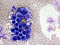 Fluffy/smudged large cells (~2-3x RBC dia.) with an indistinct nucleus: