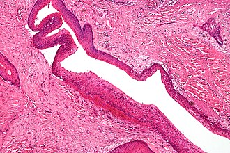 | LM | stratified epithelium with "ribbon-like appearance" with palisaded basal cell layer, parakeratosis, artefactual separation of epithelium from the basement membrane |