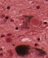 • Lewy bodies and extracellular pigment in neuromelanin-containing nuclei (SN, LC, DVN) -> PD.