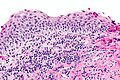 | LM | squamous epithelium with: spongiosis, lack of stratum granulosum and stratum corneum layers, "lozenge"-shaped (diamond-like shape); abundant plasma cells - esp. superficial dermis; +/-hemosiderin deposits |