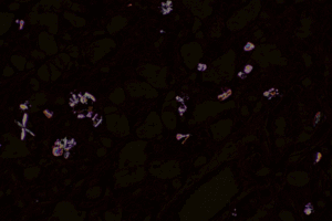 Crystals (gout) and blood cells in polarized light. (WC/Gabriel Caponetti)