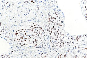 - ↑ Boulagnon-Rombi, C.; Fleury, C.; Fichel, C.; Lefour, S.; Marchal Bressenot, A.; Gauchotte, G. (04 2017). "Immunohistochemical Approach to the Differential Diagnosis of Meningiomas and Their Mimics.". J Neuropathol Exp Neurol 76 (4): 289-298. doi:10.1093/jnen/nlx008. PMID 28340171.