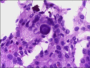 - ↑ Parwani, AV.; Chan, TY.; Ali, SZ. (Apr 2004). "Significance of psammoma bodies in serous cavity fluid: a cytopathologic analysis.". Cancer 102 (2): 87-91. doi:10.1002/cncr.20161. PMID 15098252.