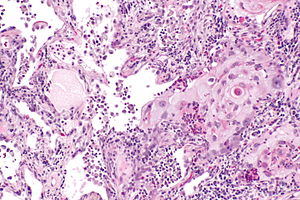 Squamous cell carcinoma of the lung, also lung squamous cell carcinoma, is a common malignant lung tumour that is associated with smoking.