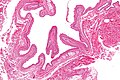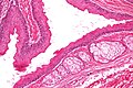 | LM | cyst lined by squamous epithelium with a corrugated eosinophilic lining, no granular cell layer |