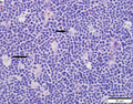 Thymoma (right of image) and remnant of normal thymus (left of image). H&E stain. (WC) | |