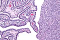 - Tubal intraepithelial carcinoma - discrete papillary growth, loss of nuclear polarity, nuclear atypia.
