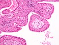 - Papillae (nipple-shaped structures) with a two rows of pink (eosinophilic) epithelial cells (with cuboidal basal cells and columnar luminal cells) - key feature.